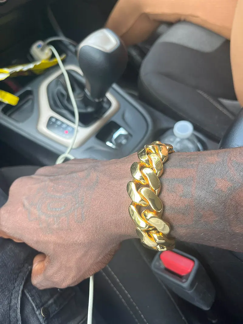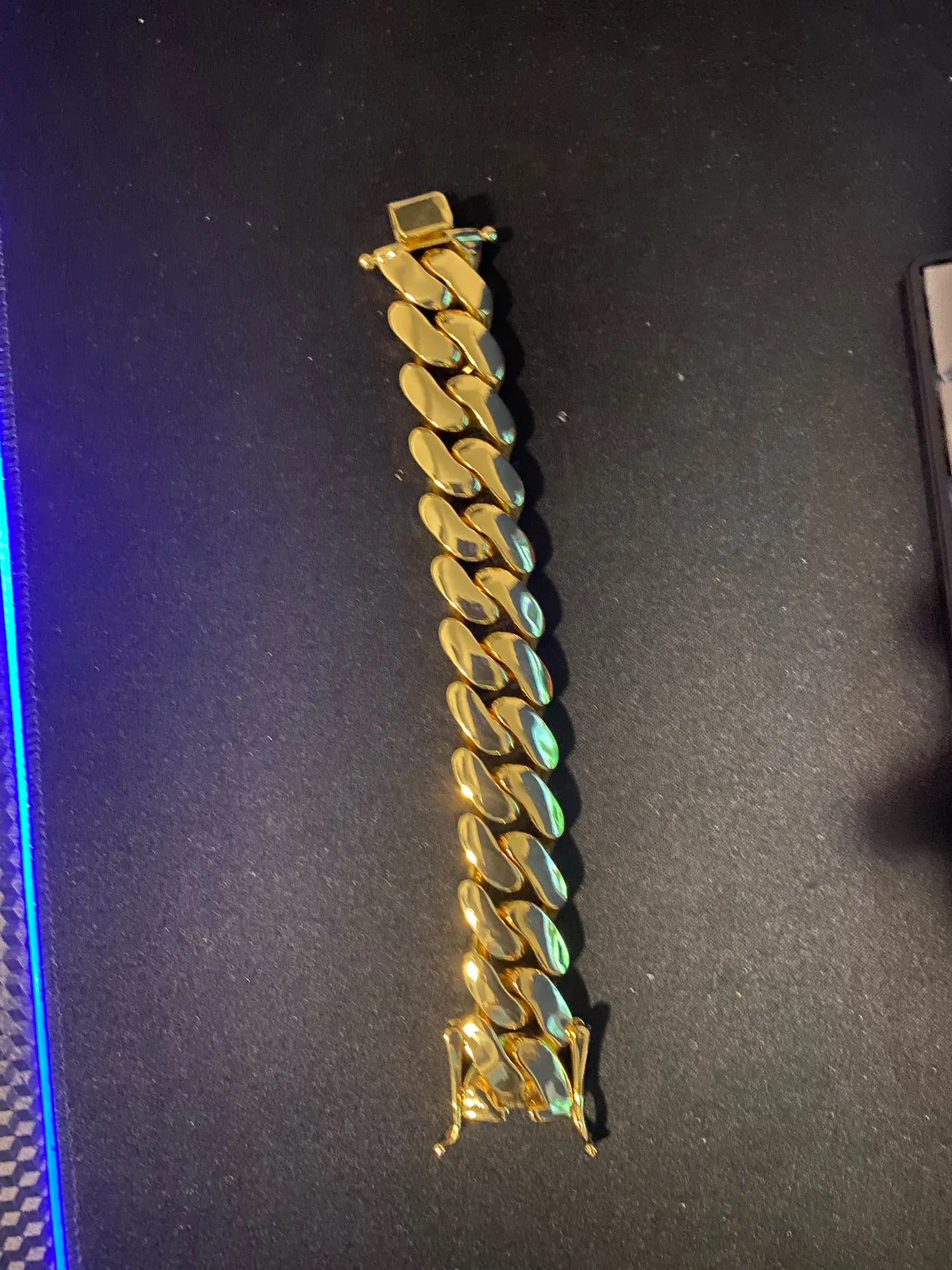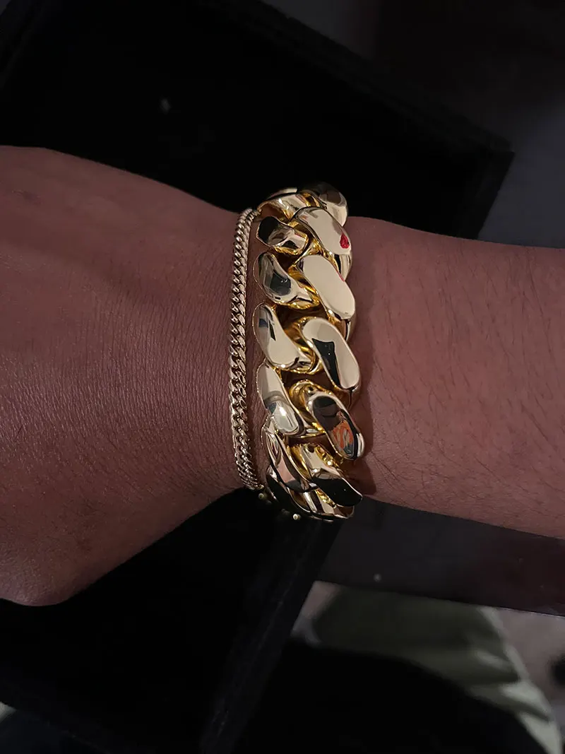 This 22mm wide hip hop bracelet features a heavy Miami Cuban link design plated in gold for a bold, stylish statement. Crafted from durable copper, its chunky geometric pattern suits men seeking a standout accessory for parties or urban looks. Custom logos are accepted, allowing personalized flair while maintaining quality and strong visual impact. Ideal for those who appreciate fine, fashion-forward jewelry with a rock-inspired edge.